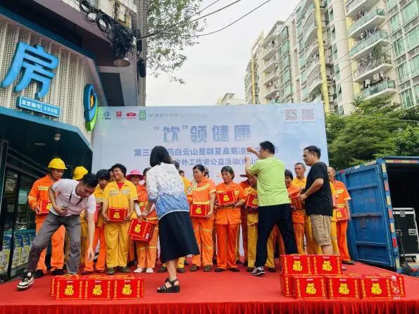 活動(dòng)現(xiàn)場(chǎng),白云山星群為環(huán)衛(wèi)工人獻(xiàn)上“星群夏桑菊清涼飲料”防暑物資,感謝他們?cè)谙娜湛崾顖?jiān)守崗位、為城市干凈整潔付出辛勤的勞動(dòng)。
