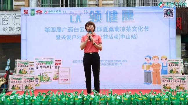 白云山星群公司總經(jīng)理賀慶在臺(tái)上致辭:"涼茶作為中國(guó)傳統(tǒng)文化的一部分,在炎炎夏日,一杯涼茶不僅能消暑解渴,更能帶來(lái)心靈的慰藉。我們白云山星群藥業(yè)將通過(guò)舉辦涼茶文化節(jié)的形式,向廣大市民普及涼茶知識(shí),推廣健康生活方式,同時(shí)也讓?xiě)敉夤ぷ髡邆兏惺艿缴鐣?huì)的溫暖與關(guān)懷。白云山星群夏桑菊在涼茶類產(chǎn)品是產(chǎn)品的領(lǐng)導(dǎo)者,占有絕對(duì)的市場(chǎng)份額,白云山星群和中山中智在業(yè)務(wù)上保持著強(qiáng)勁的戰(zhàn)略合作伙伴關(guān)系,我們也希望能為廣大消費(fèi)者提供更齊全、更專業(yè)的藥品服務(wù)。關(guān)愛(ài)環(huán)衛(wèi)工人,白云山星群藥業(yè)一直在行動(dòng),今后,我們也會(huì)聯(lián)合更多的連鎖共同開(kāi)展系列公益活動(dòng),為共建和諧美好的社會(huì)盡一份力量!”