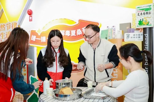 在夏桑菊顆粒制作體驗區(qū),在工作人員的指導下,市民朋友們體驗從涼茶到夏桑菊顆粒制備的成粒、過篩過程。成功完成體驗的市民,現(xiàn)場試飲夏桑菊飲料,體驗收獲感滿滿。