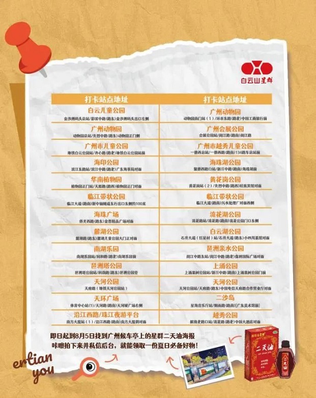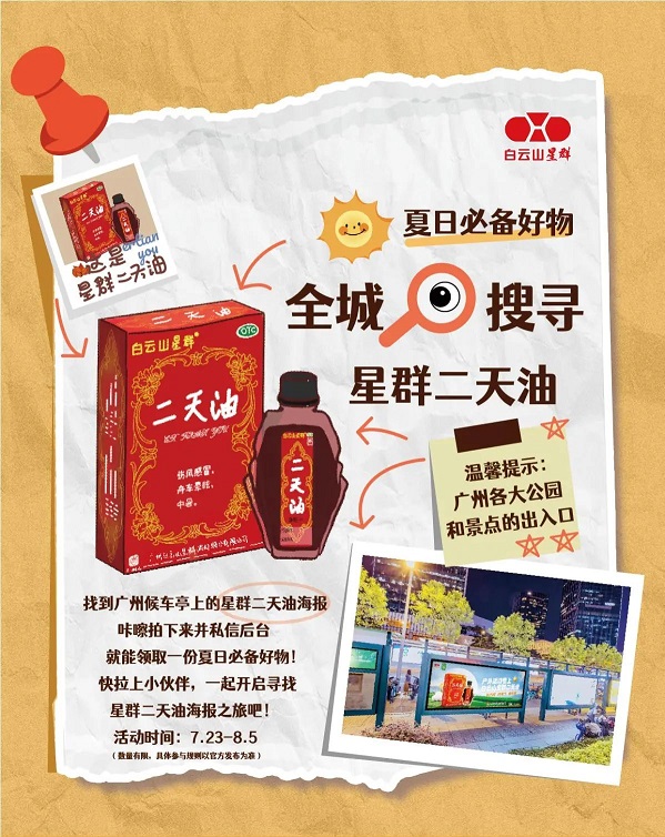 在廣州,公園是市民日常散步、鍛煉、休閑的熱門去處??紤]到戶外活動時人員相對集中,蚊蟲叮咬風(fēng)險較高,白云山星群精準(zhǔn)發(fā)力,在廣州 24 個公園、景區(qū)出入口的候車亭投放了醒目的廣告。當(dāng)市民準(zhǔn)備入園開啟休閑時光,或是到景點(diǎn)游玩觀光時,都能一眼看到這些廣告。廣告?zhèn)鬟f的核心信息清晰明確 —— 戶外出行,記得帶上星群二天油。二天油作為白云山星群的特色草本產(chǎn)品,依托薄荷腦、薄荷油、冰片及由梔子、艾葉、血竭提煉制成黑油的復(fù)合配方,形成驅(qū)蚊防護(hù)網(wǎng),在一定程度上抵御蚊蟲侵?jǐn)_,幫助市民減少被蚊子叮咬的概率,從而降低感染基孔肯雅熱的風(fēng)險,讓大家能在戶外盡情享受自然與陽光。