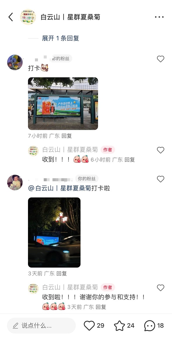 看到這些戶外廣告的市民,還能參與到有趣的線上互動中。白云山星群在小紅書同步發(fā)起了 “拍立得” 活動,在廣告投放期間,市民只要拍下公園候車亭的星群二天油廣告,發(fā)布到白云山星群夏桑菊小紅書官方賬號,就有機(jī)會獲得一份防蚊禮包。這樣的互動活動,讓市民在出行途中既能收獲健康提示,又有機(jī)會贏取福利,受到不少人的關(guān)注。