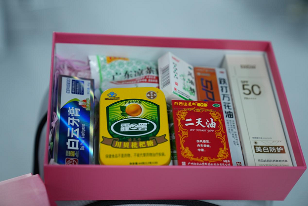 盒內精選7款廣藥旗下特色產品,涵蓋防護、舒緩、護理等多元需求,為媒體人打造移動的“工作生活百寶箱”,如防曬霜、風油精、潤喉糖,以及在廣東為人熟知,家家常備的星群二天油。