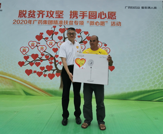 活動(dòng)伊始,集團(tuán)領(lǐng)導(dǎo)、各對(duì)應(yīng)扶貧企業(yè)領(lǐng)導(dǎo)、鎮(zhèn)領(lǐng)導(dǎo)以及貧困戶代表出席了主題為“脫貧齊攻堅(jiān),攜手圓心愿”的精準(zhǔn)扶貧專項(xiàng)“微心愿”活動(dòng)。本次“微心愿”活動(dòng)得到星群公司廣大員工的積極響應(yīng),僅一天時(shí)間就有60余名集團(tuán)員工及120名星群?jiǎn)T工(集體)報(bào)名參加,為徑口村60名貧困戶獻(xiàn)上濃濃的愛(ài)心?;顒?dòng)現(xiàn)場(chǎng),楊軍總經(jīng)理為徑口村貧困戶代表林國(guó)強(qiáng)送上了他的小心愿電風(fēng)扇一臺(tái)?;糁境蓵?shū)記也為貧困戶代表劉冬菊送上她的微心愿物資。駐村干部王卡和團(tuán)委書(shū)記李霖珠在現(xiàn)場(chǎng)被授予“廣藥愛(ài)心傳遞大使”綬帶。