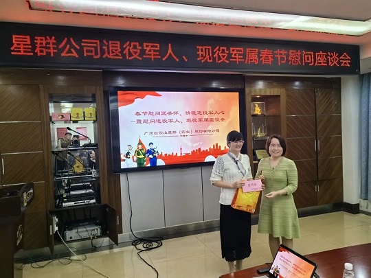 隨后,大家紛紛表示,今后將不忘初心,永葆軍人本色,以良好的道德情操、昂揚的精神風(fēng)貌、飽滿的工作熱情干好本職工作,為公司高質(zhì)量發(fā)展做出新的貢獻。座談會結(jié)束前星群公黨委書記、董事長胡文新,黨委副書記、工會副主席鄺敏儀分別為退役軍人、現(xiàn)役軍屬送上春節(jié)慰問品。