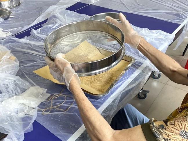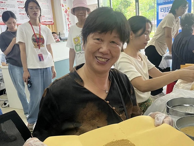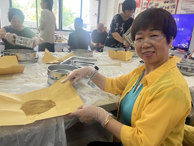 隨后在傳承人張郁林的指導(dǎo)下,居民開(kāi)始體驗(yàn)制作夏桑菊顆粒,將輔料及凈膏揉搓至“握之成團(tuán)、觸之即散”的狀態(tài),過(guò)篩后最終得到顆粒成品。
