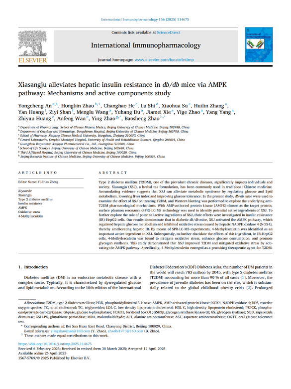 為驗(yàn)證夏桑菊顆粒的對(duì)T2DM的治療作用,星群公司聯(lián)合北京中醫(yī)藥大學(xué)共同完成了夏桑菊調(diào)控AMPK信號(hào)通路改善T2DM肝臟胰島素抵抗的作用機(jī)制及潛在活性成分4-甲基七葉亭的研究。本研究首次闡明夏桑菊改善T2DM的作用機(jī)制可能通過激活A(yù)MPK信號(hào)通路,并調(diào)控AMPK/NOX4/PI3K/AKT信號(hào)網(wǎng)絡(luò)實(shí)現(xiàn)。通過系統(tǒng)性實(shí)驗(yàn)研究,創(chuàng)新性發(fā)現(xiàn)4-甲基七葉亭是夏桑菊治療糖尿病的關(guān)鍵活性成分。該成果不僅揭示了傳統(tǒng)中藥復(fù)方的現(xiàn)代藥理學(xué)機(jī)制,更重要的是為糖尿病創(chuàng)新藥物研發(fā)提供了全新候選化合物和理論依據(jù),對(duì)推動(dòng)中醫(yī)藥現(xiàn)代化和糖尿病防治具有重要的臨床價(jià)值與應(yīng)用前景。