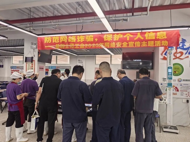 活動啟動當天,公司工會午餐時段在職工食堂設立“網(wǎng)絡安全宣傳攤位”,工作人員為職工提供面對面咨詢,實時解答網(wǎng)絡安全相關問題。并在現(xiàn)場設置二維碼引導職工在線學習,方便員工自主獲取知識,這種線上線下同步結合的創(chuàng)新宣講方式獲得員工的肯定。